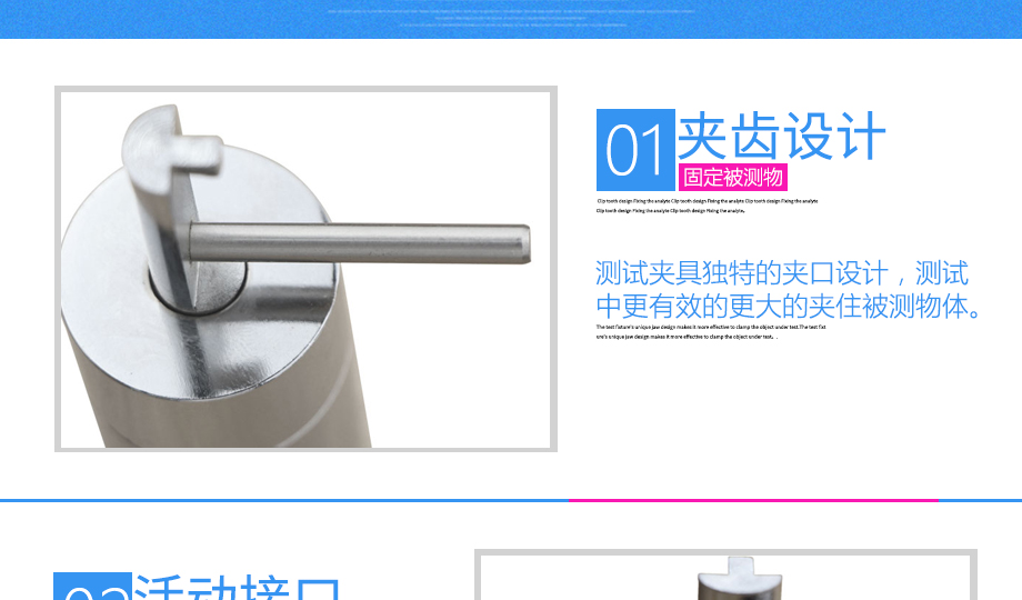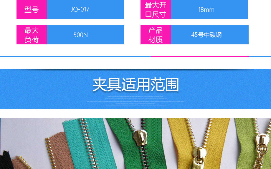 產(chǎn)品型號(hào):JQ-017 品牌:劍 喬 用途:拉鏈夾具適用范圍:拉鏈材料的拉力,破壞力測試。