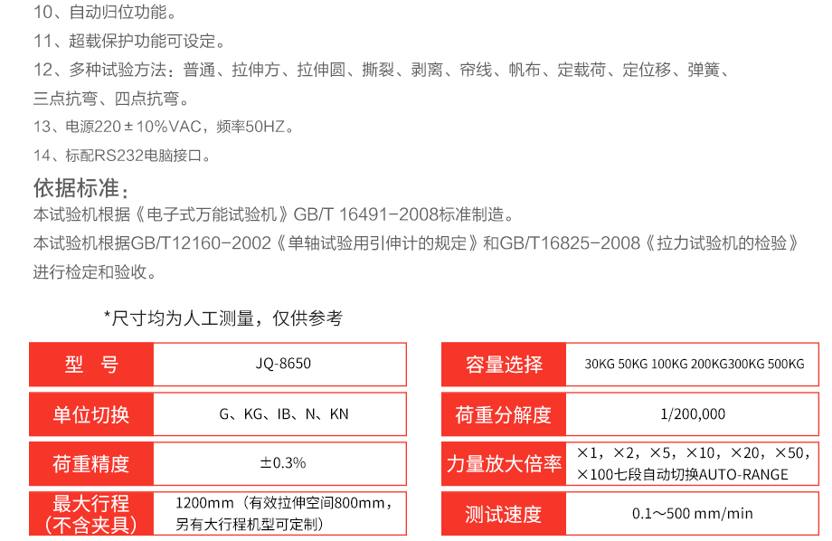 產(chǎn)品型號:JQ-8650 品牌:劍 喬 用途:本系列機廣泛用于各類五金、橡膠制品、鞋類、皮革、服裝、紡織、建材、絕緣體、電線、電纜、端子等各類材料。測試其拉伸、撕裂、剝離、抗壓、彎曲、抗剪切、定荷重、定位移、